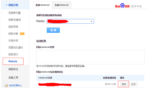 如果看到robots內容和你更改后的內容不一致,有幾種可能:第一種可能是網站沒有全面布局,因為有的站點服務器可能在很多地方,你需要確認robots是否已全部推送;第二種可能是百度沒有及時做更新,可以通過robots檢測工具下方的更新按鈕來告訴百度Robots有變化。