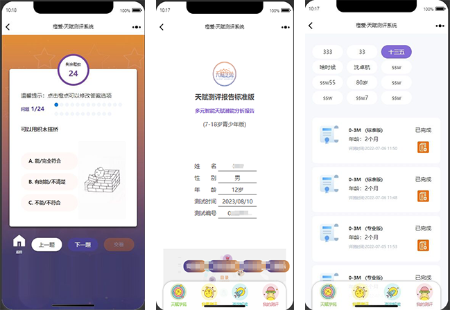 橙愛測評系統(tǒng)用到的八大智能數(shù)據(jù)、測評試卷、測評題目、測評結(jié)果數(shù)據(jù)、測評報(bào)告數(shù)據(jù)、測評報(bào)告訂單、訪問日志、報(bào)告解鎖碼和預(yù)約用戶等內(nèi)容進(jìn)行管理。系統(tǒng)支持多用戶多年齡段的測評,根據(jù)用戶端測試結(jié)果進(jìn)行數(shù)據(jù)處理,從而形成測評對象的專業(yè)測評報(bào)告,傳輸給前端用戶查閱。